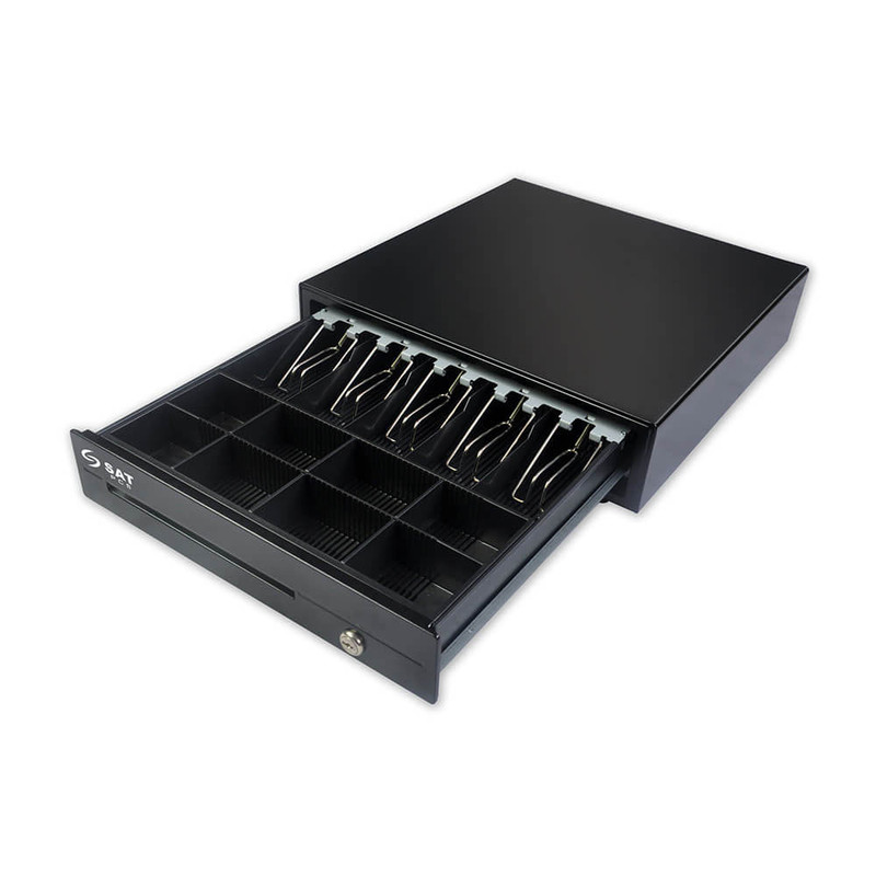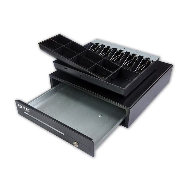 El cajón monedero sat 119X, está diseñado para gran almacenamiento de dinero, incorpora un riel y base metálica para bandeja, probado a más de un millón de ciclos de apertura, con 8 compartimentos para monedas y 5 para billetes además de incluir su pisa billetes metálicos y una interfaz de conexión RJ11.